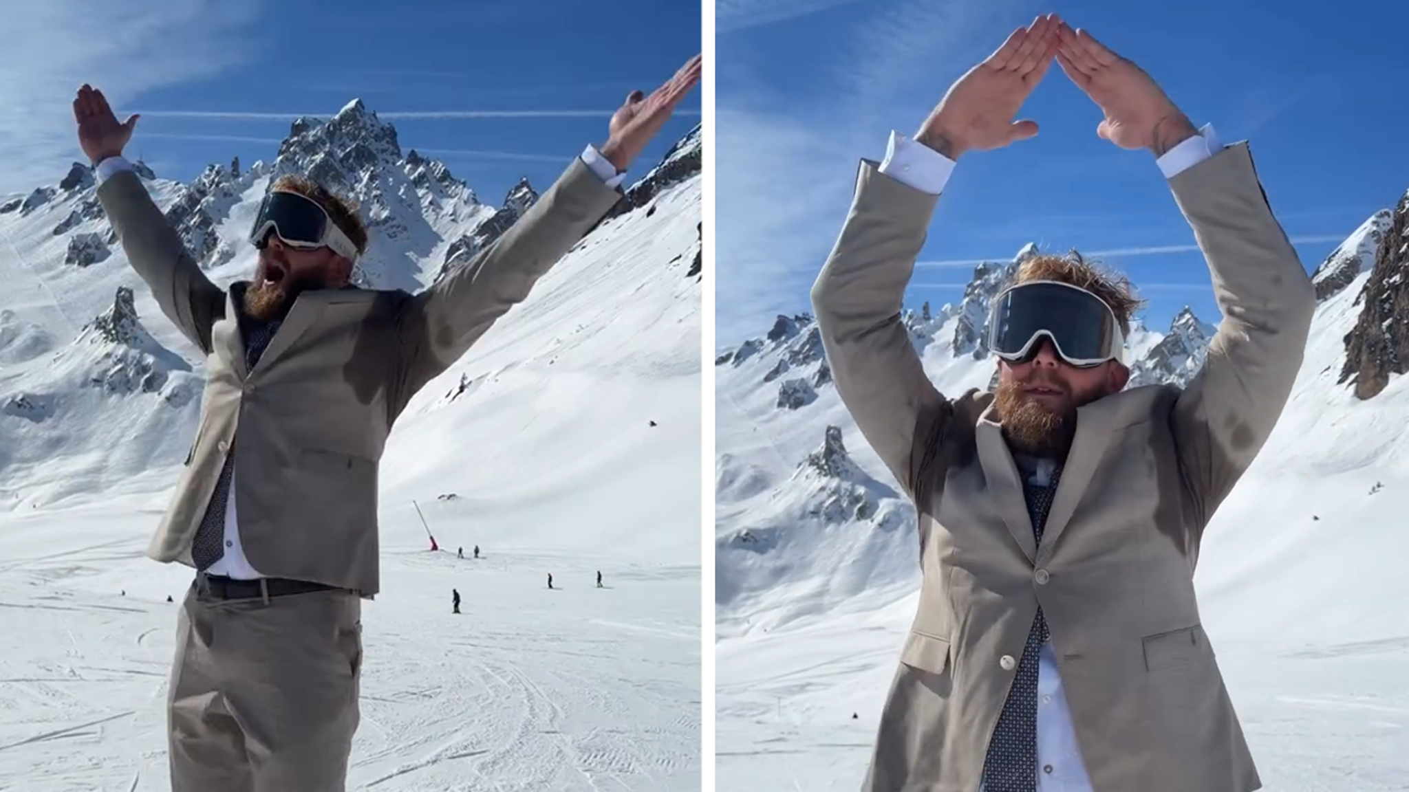 Tofu slabs on a bed of rice next to a small arugula salad.
